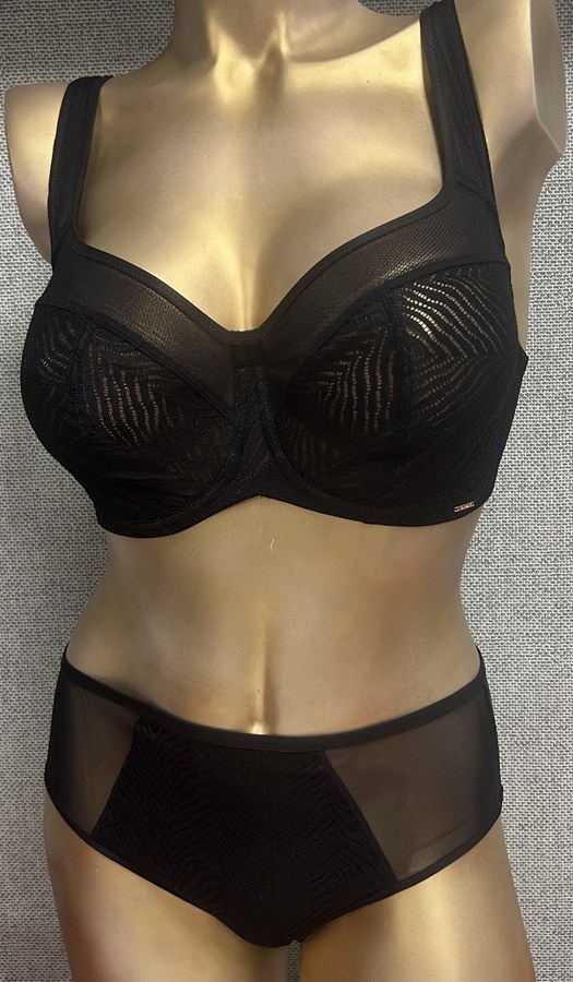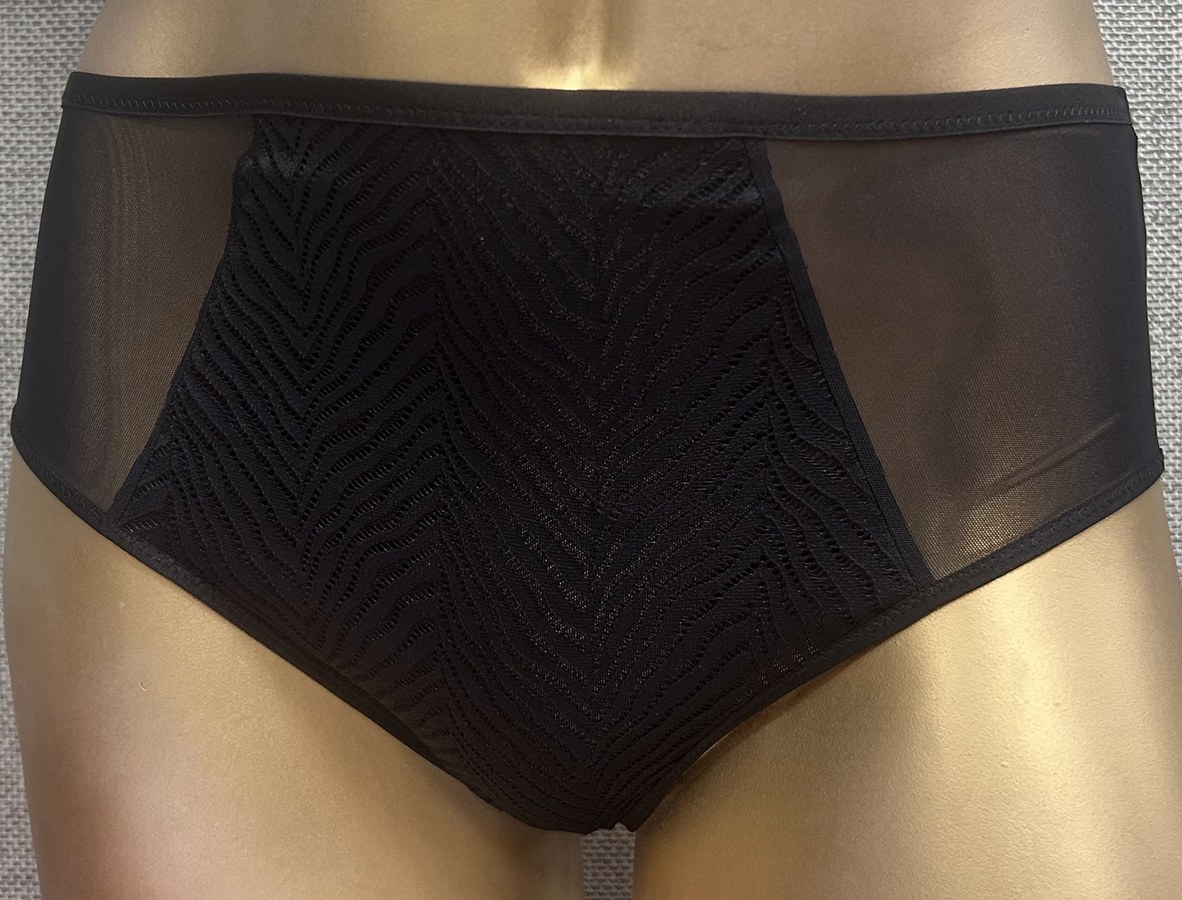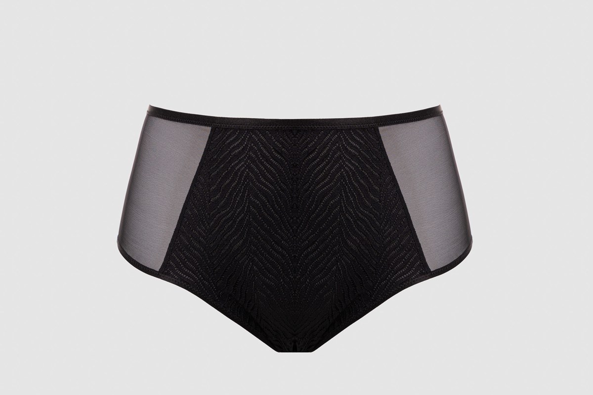 Przód zdobi delikatny, geometryczny haft na transparentnym tiulu, który nadaje bieliźnie nowoczesny i kobiecy charakter. Boki oraz tył wykonano z gładkiej, elastycznej mikrofibry, dzięki czemu figi pozostają niewidoczne pod ubraniem.