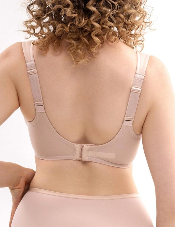 Szerokie, regulowane ramiączka równomiernie rozkładają ciężar biustu, zwiększając komfort noszenia i zapobiegając wrzynaniu się w ramiona. Stabilny obwód oraz klasyczne zapięcie na haftki zapewniają dobre dopasowanie i pewność noszenia przez cały dzień.