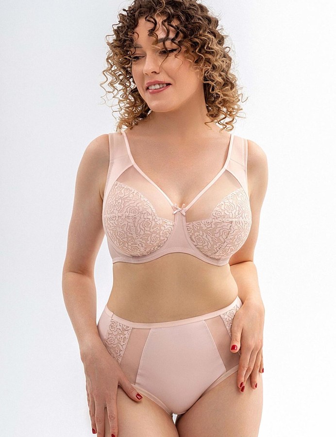 Miękkie miseczki delikatnie otulają biust, nadając mu naturalny kształt bez efektu usztywnienia. Konstrukcja często oparta na kilku częściach pozwala na lepsze zebranie i podtrzymanie piersi, co jest szczególnie istotne przy większym biuście. Subtelne wykończenia oraz elegancki odcień krem brulee nadają modelowi ponadczasowy, kobiecy charakter.