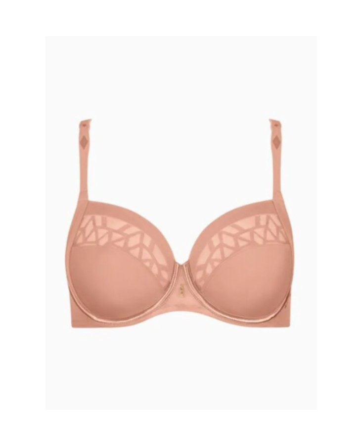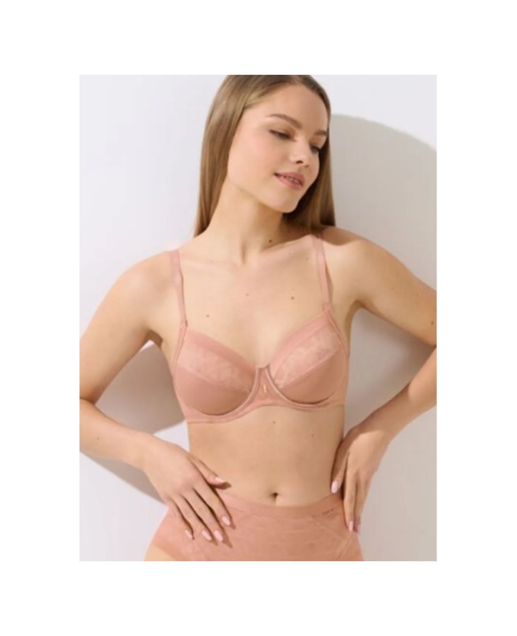 Biustonosz posiada miękkie, nieusztywniane miseczki na fiszbinach, które naturalnie modelują biust, jednocześnie gwarantując odpowiednie wsparcie. Delikatne połączenie gładkiej tkaniny z elegancką koronką o geometrycznym wzorze nadaje całości nowoczesnego i kobiecego charakteru.