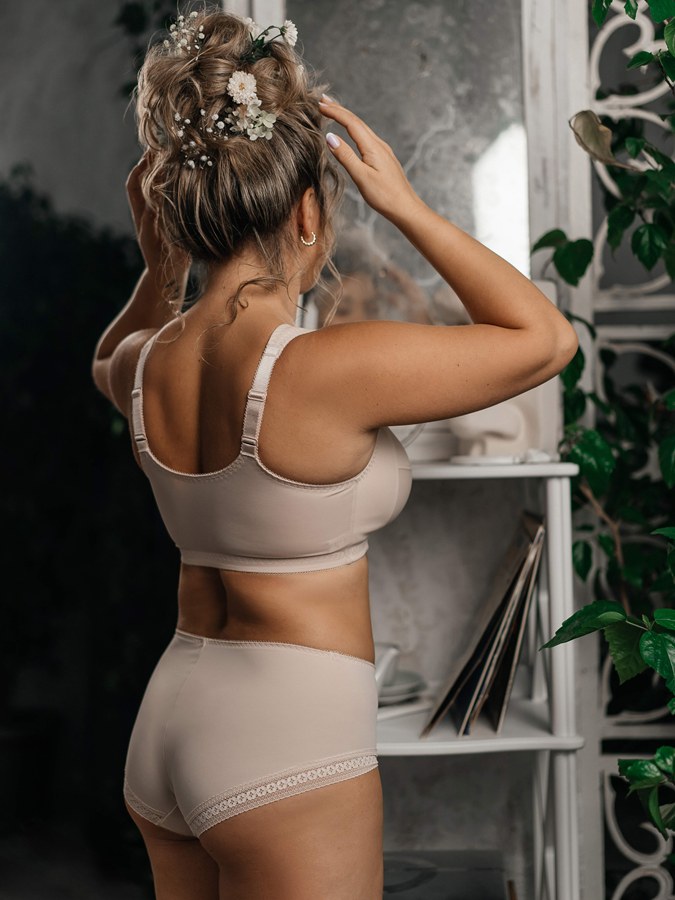 • Boczna część miseczki wykończona wkładką Simplex, płynnie łącząca się z ramiączkami — zbiera boczną tkankę i przybliża biust do środka.