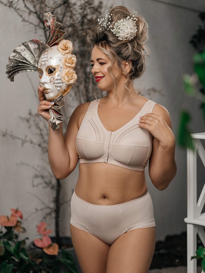 Biustonosz typu „Soft”, bez fiszbin, zapinany z przodu – idealny dla kobiet, które mają trudność z przekładaniem rąk za plecy. Dedykowany zwłaszcza dla większych miseczek, oferuje komfort, praktyczność i estetyczne wsparcie, jednocześnie optycznie redukując biust