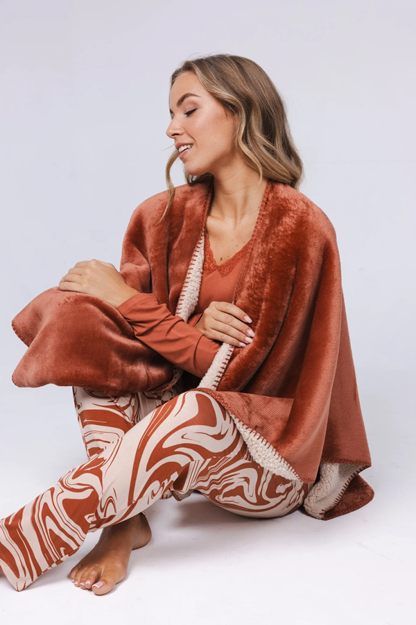 Materiał: wnętrze wykonane z miękkiego sherpa fleece, zewnętrzna strona – z przyjemnego flannel fleece, obie w 100% z poliestru — zaprojektowane z myślą o maksymalnym cieple i przyjemności w dotyku. Materiał jest lekki, oddychający, nie gniecie się i pozostaje delikatny dla skóry