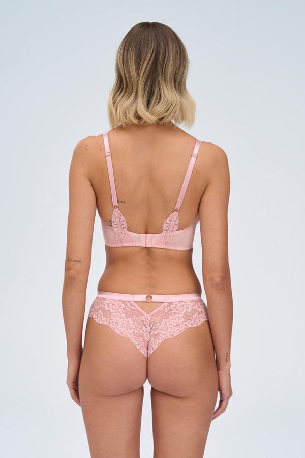 Powder Whisper figi brazylijskie to zmysłowy model majtek damskich wykonany z delikatnej koronki w modnym odcieniu pudrowego różu z detalami w kolorze złota. Majtki o brazylijskim kroju łączą kobiecy styl z lekkością i komfortem, podkreślając naturalne kształty sylwetki i dodając niezwykłej elegancji Twojej bieliźnie.