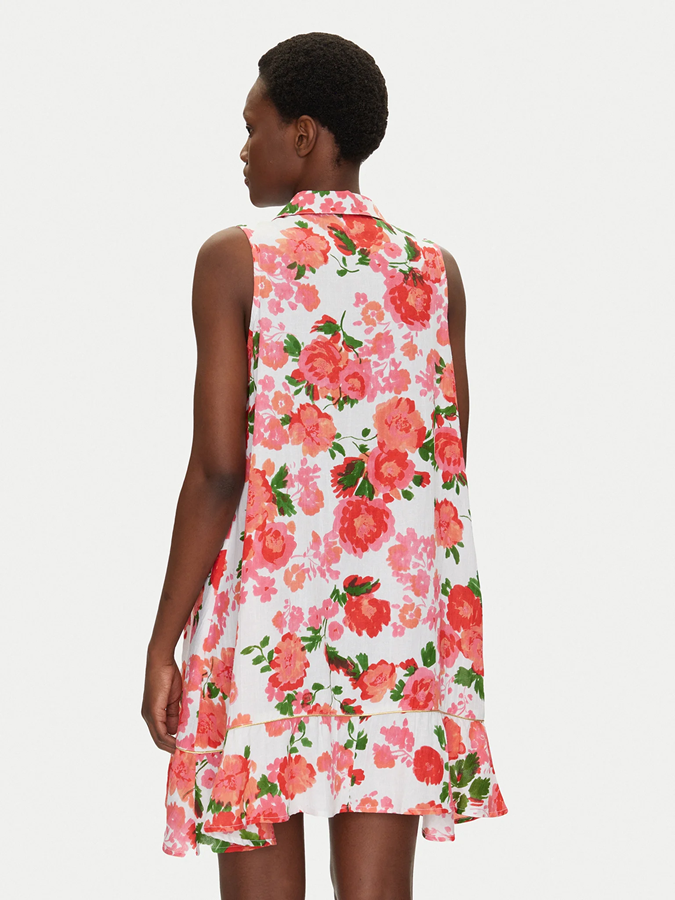Uszyta z delikatnego, przewiewnego materiału, sukienka gwarantuje komfort nawet w najcieplejsze dni. Klasyczny kołnierzyk, zapięcie na guziki i dłuższy tył nadają jej szyku i pozwalają na różnorodne stylizacje – możesz nosić ją zarówno jako sukienkę, jak i narzutkę na kostium kąpielowy.