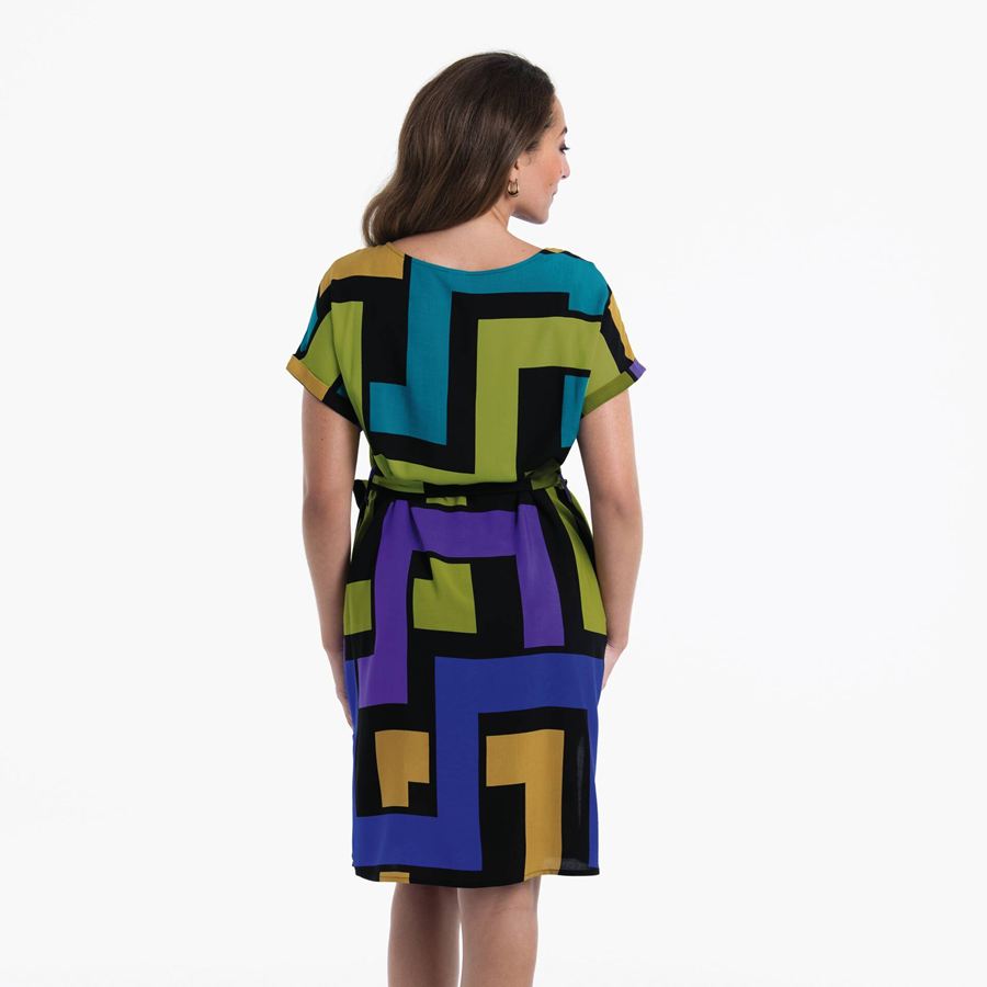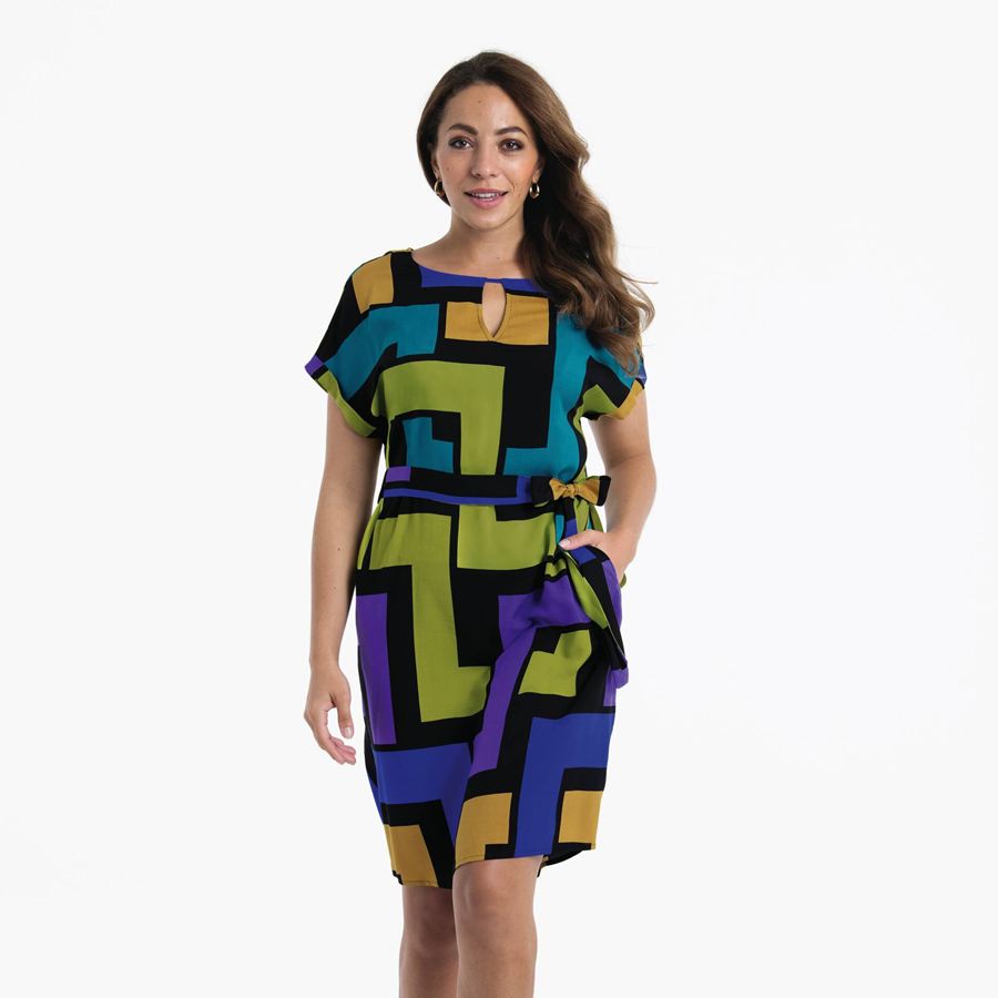 Sukienka wyróżnia się delikatnym dekoltem w kształcie litery V, który subtelnie eksponuje szyję i podkreśla kobiecą linię ramion. Luźny krój o prostym fasonie zapewnia swobodę ruchów i komfort nawet w upalne dni, a miękki, przewiewny materiał otula ciało, gwarantując lekkość i przewiewność.